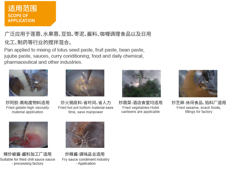 本產(chǎn)品鍋體為一次沖壓成型的半球不銹鋼鍋體,采用電加熱、蒸汽加熱、燃?xì)饧訜?攪拌方式采用特殊的傾斜傳動(dòng),使用的行星攪拌器與鍋體充分接觸,實(shí)現(xiàn)傳動(dòng)公轉(zhuǎn)與自轉(zhuǎn)的不整數(shù)傳動(dòng)比,使鍋內(nèi)無(wú)攪拌死角。使用先進(jìn)的傳動(dòng)與密封結(jié)構(gòu),使傳動(dòng)部分與鍋內(nèi)潔凈、衛(wèi)生。采用變頻調(diào)速動(dòng)力,運(yùn)行更平穩(wěn)。電磁加熱形式打破了明火烹調(diào)方式,具有升溫快、無(wú)明火、無(wú)煙塵、無(wú)有害氣體,對(duì)周?chē)h(huán)境不產(chǎn)生熱輻射,安全性好和外觀美觀等特點(diǎn),是性能優(yōu)良的食品加工設(shè)備。